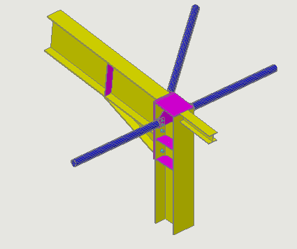 Rámové spojení sloupu s příčlí je provedeno pomocí šroubovaného rámového rohu. Rámový roh se skládá ze svislé výztuhy přípoje provedené z úpalku I profilu stejné třídy jako je navržená příčle, svislých výztuh příčle (v místě konce svislé výztuhy přípoje) a vodorovných výztuh sloupu (v místě horní a dolní pásnice příčle a pásnice výztuhy přípoje). Spojení obou konstrukčních prvků je provedeno na čelní desku.
