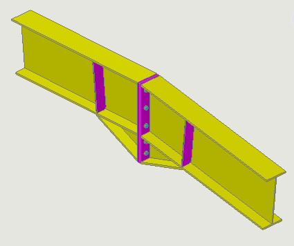 Spojení příčlí ve vrcholu rámu je provedeno pomocí šroubovaného rámového rohu. Přípoj je složen ze svislých výztuh přípoje provedených z úpalku I profilu stejné třídy jako je navržená příčel a svislých výztuh příčle (v místě konce svislé výztuhy přípoje). Spojení v hřebeni je provedeno na čelní desku.
